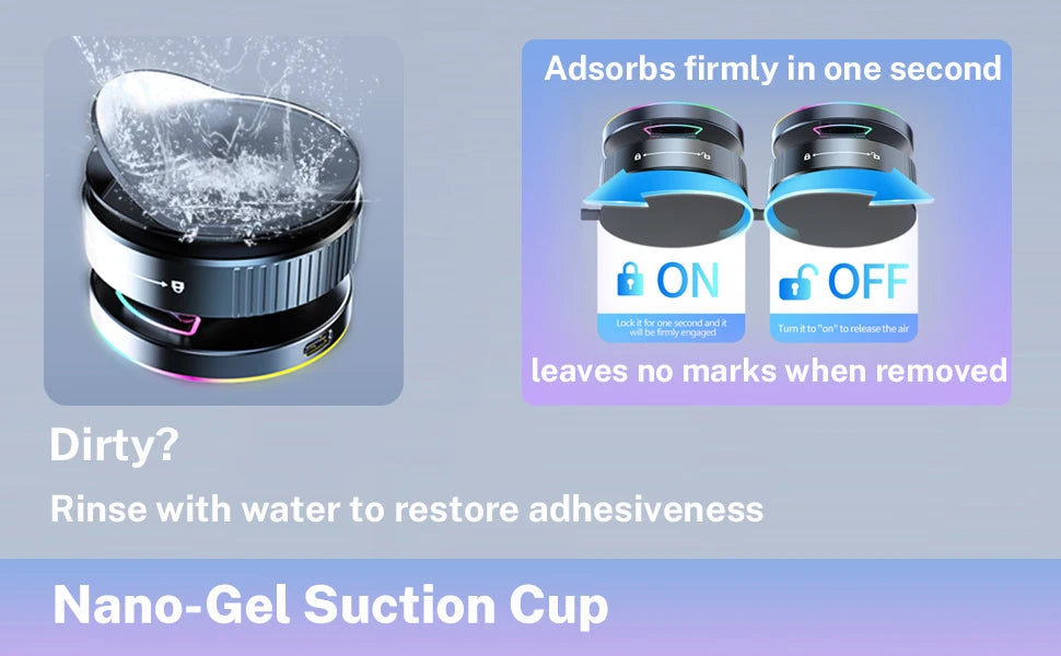4. Mounting: Nano-gel suction cup with strong vacuum grip